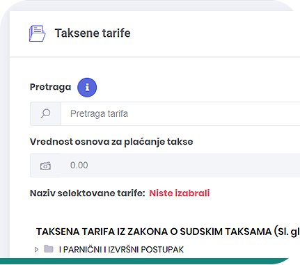 Namenjen izračunavanju sudskih taksi koje se plaćaju u postupku pred sudovima, a prema Taksenoj tarifi koja je sastavni deo Zakona o sudskim taksama i Tarife pokrajinskih administrativnih taksi za spise i radnje organa u Autonomnoj Pokrajini Vojvodini koja je sastavni deo Pokrajinske skupštinske odluke o pokrajinskim administrativnim taksama.